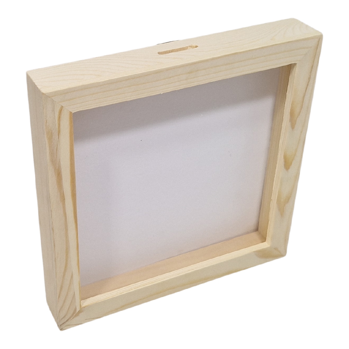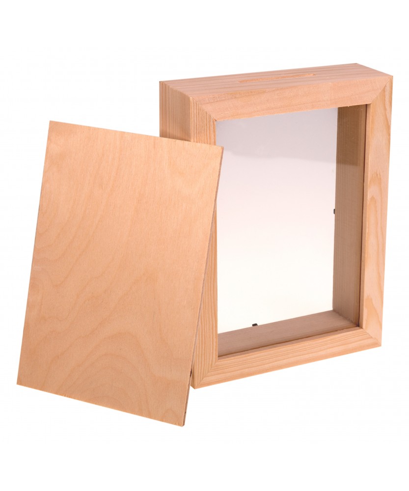 De leuke spaarpotten zijn gemaakt van hout met plexiglas.